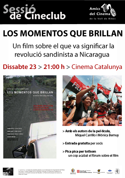 Dissabte 23 d'octubre a les 21:00h Us tornem a recordar que el proper dissabte 23 d'octubre els Amics del Cinema proposem una sessió molt especial, ja que comptarà amb la presència dels autors del film i es convidarà a tots els assistents a un refrigeri un cop acabada la projecció. Tots els socis tindran accés lliure a la sala. Los momentos que brillan és una pel·lícula sobre el que va significar la revolució sandinista de l'any 1979 a la societat nicaragüenca i als moviments solidaris internacionals. La revolució sandinista no només fou un aixecament popular i polític contra la dictadura de Somoza, sinó que vingué acompanyada d'accions per la dignificació i la millora de vida dels mes pobres. Sinopsi: Diferents protagonistes de la Cruzada Nacional de Alfabetización rememoren la seva celebració i les circumstàncies en les quals es va produir aquest episodi de la Revolució Popular Sandinista Nicaragüenca, entre 1979 i 1980. Paral·lelament, una de les brigadistes que van participar en aquella mobilització popular, torna al lloc on va desenvolupar la seva tasca alfabetizadora, refent un viatge que va marcar profundament la seva vida.